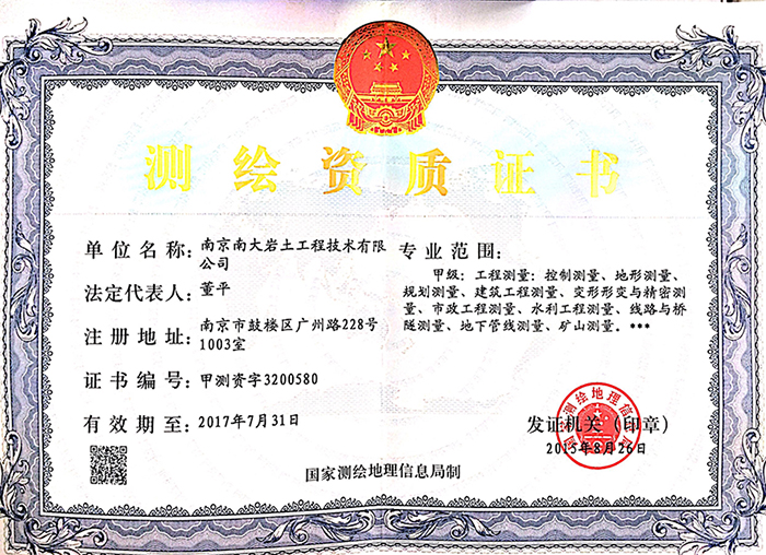 熱烈慶祝我公司取得國家測繪局頒發的甲級測繪資質證書。