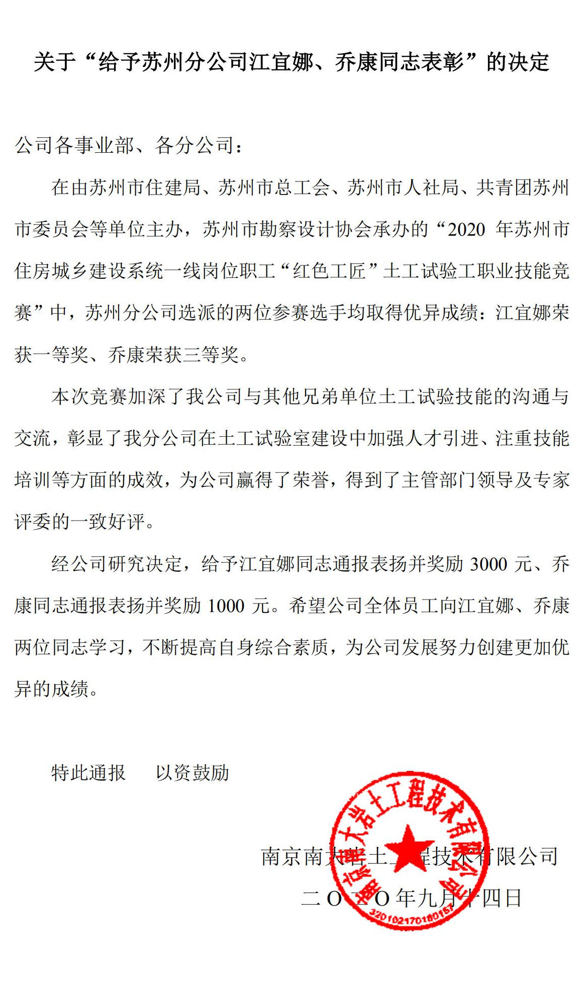 關于“給予蘇州分公司江宜娜、喬康同志表彰”的決定